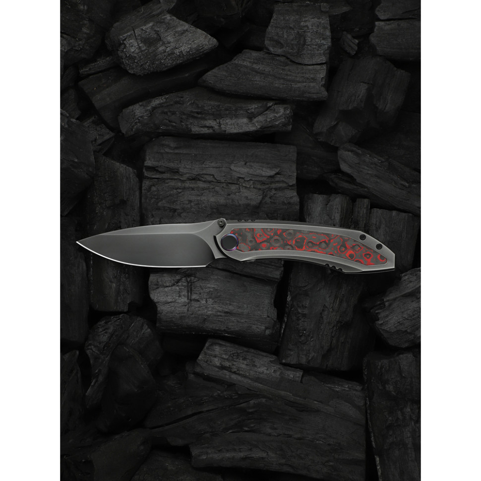 - Титанове руківʼя з інкрустацією з вуглеволокна. Аерокосмічний сплав 6Al4V характеризується ідеальним співвідношенням між міцністю та легкою вагою. Яскраві акцентні вставки з карбону роблять кожен ніж ексклюзивним та додають хвату жорсткості.