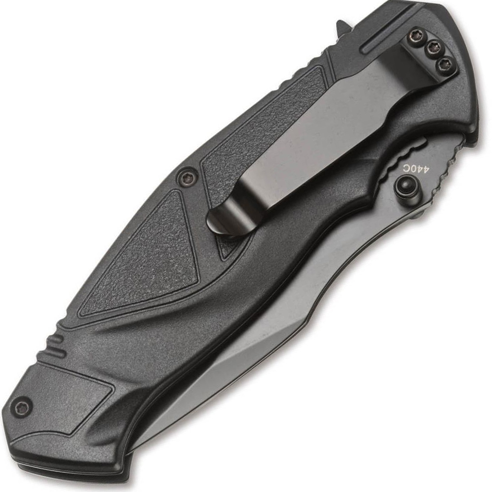 Клинок виконаний у формі Drop point з фальшлезом, широким профілем і долом, а також помітним вирізом на середній частині обуха і насічками на його початку. Така форма дозволяє проводити не тільки довгий поріз, але і ефективний укол. Він виготовлений з твердої сталі 440С і з чорним антикорозійним покриттям. Для відкриття клинка передбачені фліппер або шпеник. Фіксація здійснюється замком Linerlock.