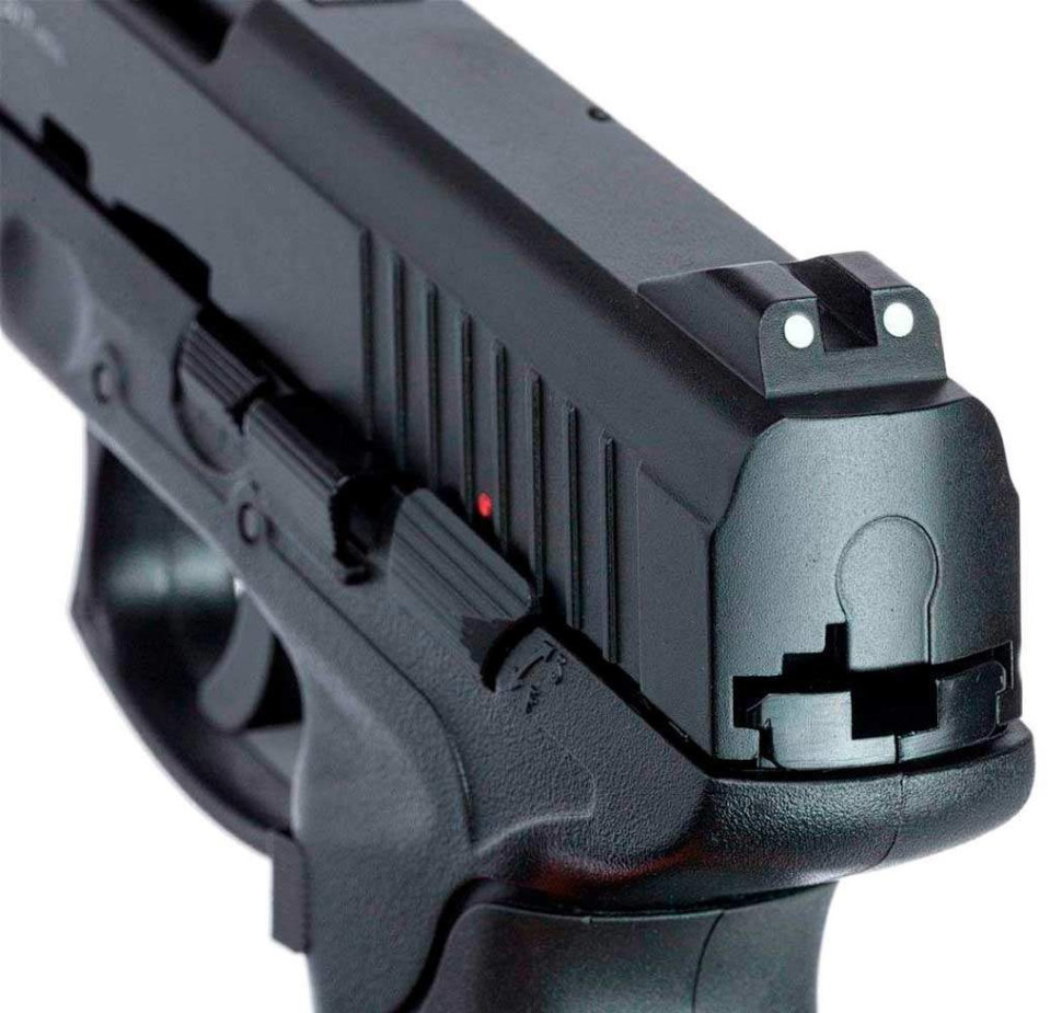 Зручна рукоятка, корпус пістолета зроблений з пластику, а рама затвора з металевого сплаву, що забезпечує надійність і невисоку ціну.