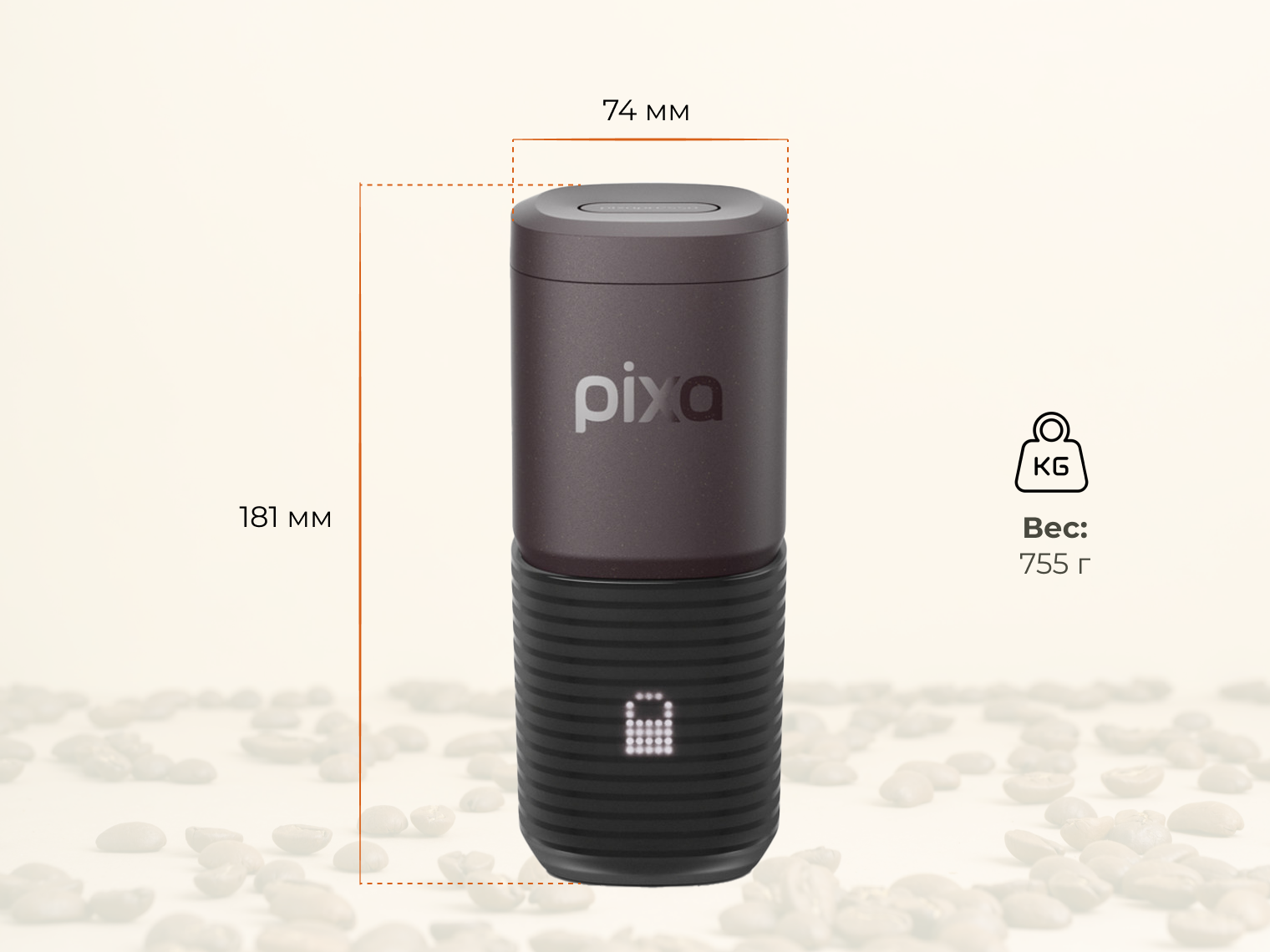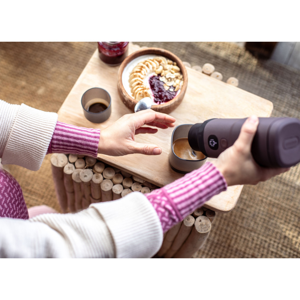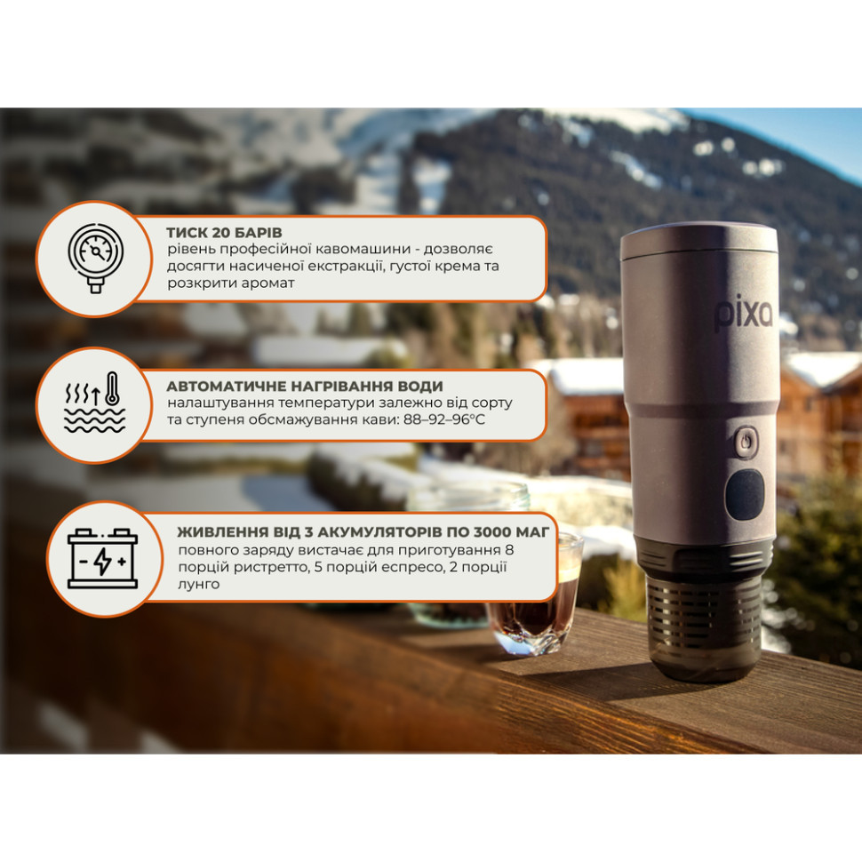 Корпус стійкий до водяних бризків, але його не можна повністю занурювати у воду або мити в посудомийній машині. З урахуванням компактності 74 х 74 х 181 мм та чохла в комплекті, Pixapresso поміщається у рюкзаку, сумці або бардачку автомобіля, щоб ви насолоджувалися улюбленими напоями у будь-якій точці світу.