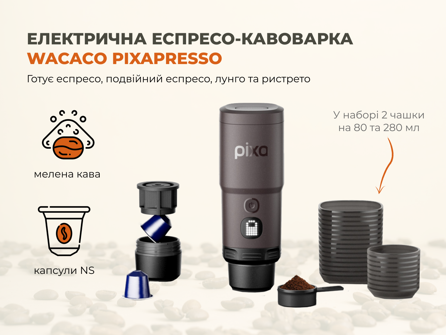 Wacaco Pixapresso — перша електрична еспресо-кавоварка від Wacaco. З її допомогою ви можете готувати улюблений гарячий напій, де б не знаходилися: вдома, на роботі, на пікніку або подорожі. Все, що вам потрібно, — улюблена кава, вода та не більше 5 хвилин часу!