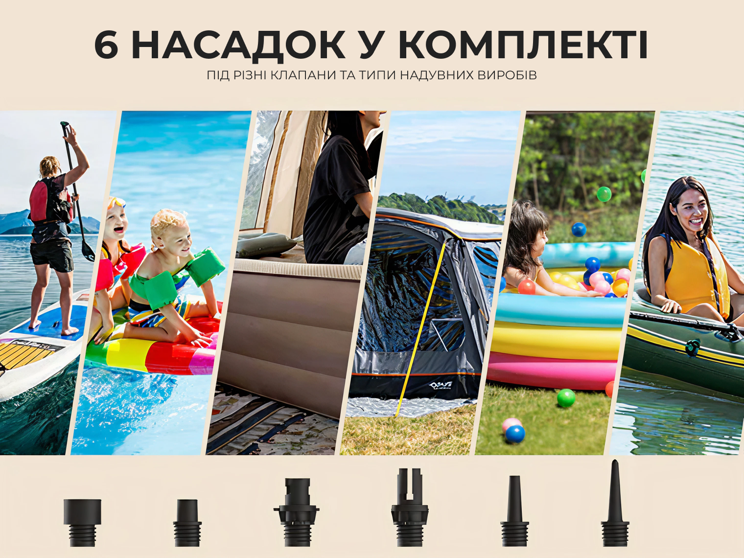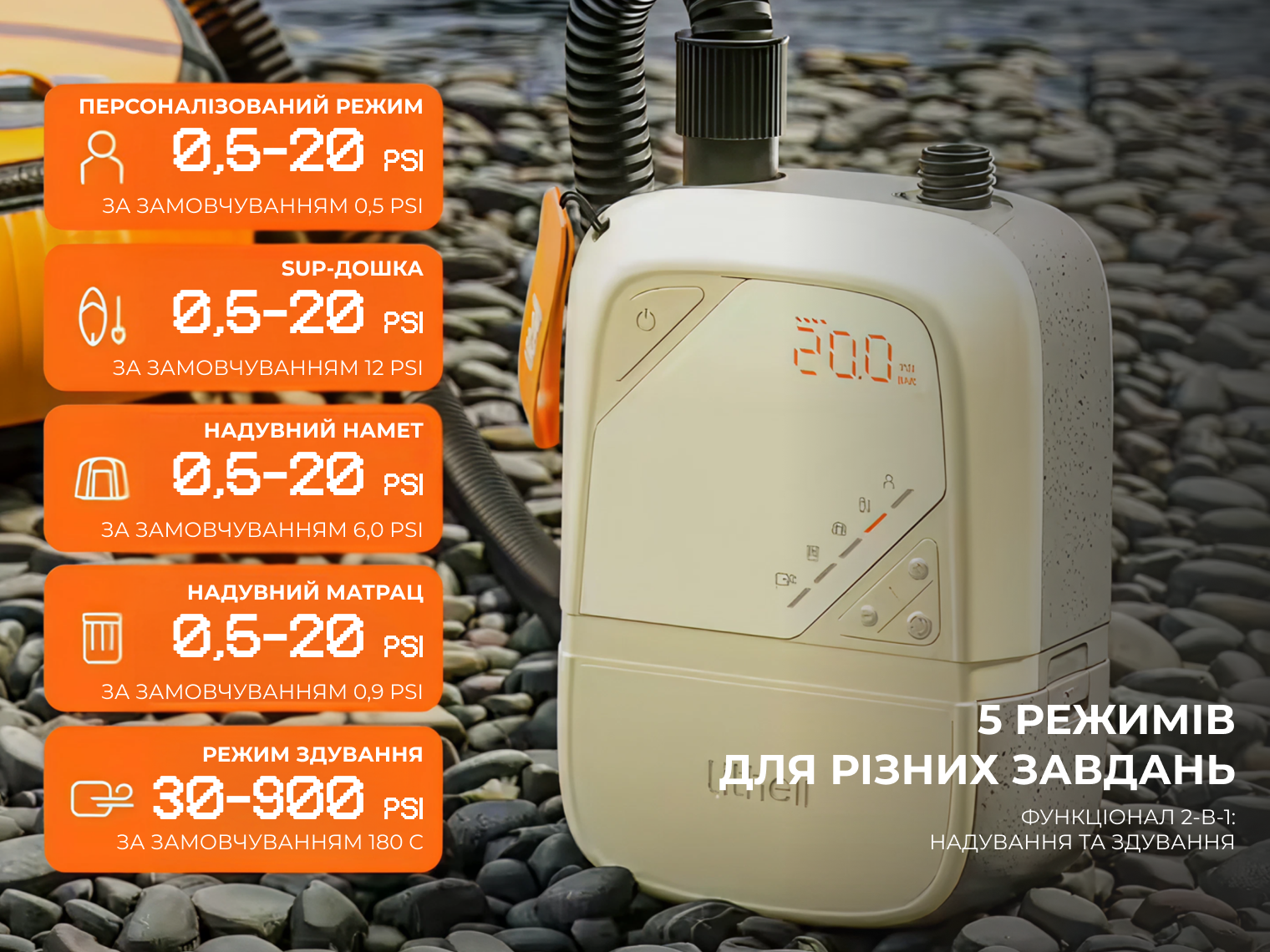 Мініатюрний насос OP20 від Litheli виконує відразу дві функції: наповнює повітрям надувні вироби та здуває їх, заощаджуючи ваш час і сили. З його допомогою ви можете надувати туристичні матраци та подушки, спортивний інвентар та інші предмети лише за кілька хвилин, а після експлуатації швидко випустити з них повітря.
