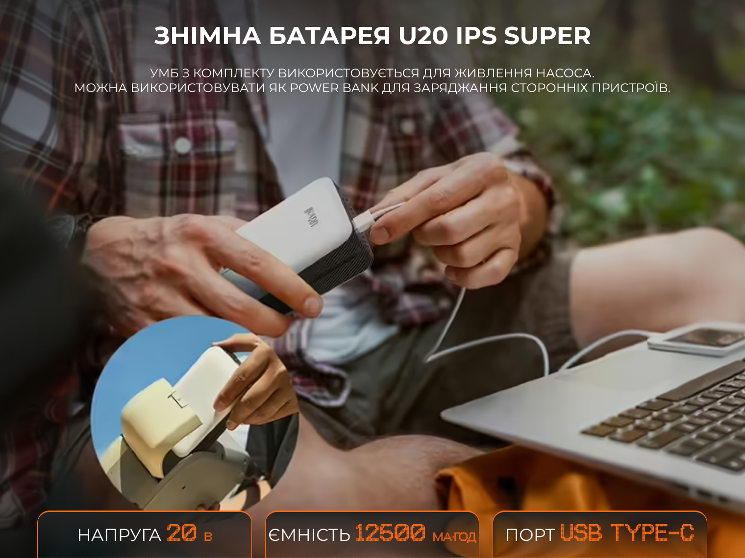 - Живлення від Power Bank. Для роботи насоса достатнього акумулятора Litheli U20 IPS SUPER BATTERY з напругою 20 В. Павербанк робить пристрій повністю автономним для експлуатації в умовах відсутності доступу до електромережі. УМБ можна використовувати й окремо, щоб заряджати смартфон, ноутбук та іншу техніку. Для цього в павербанку передбачено двонаправлений порт USB-C.