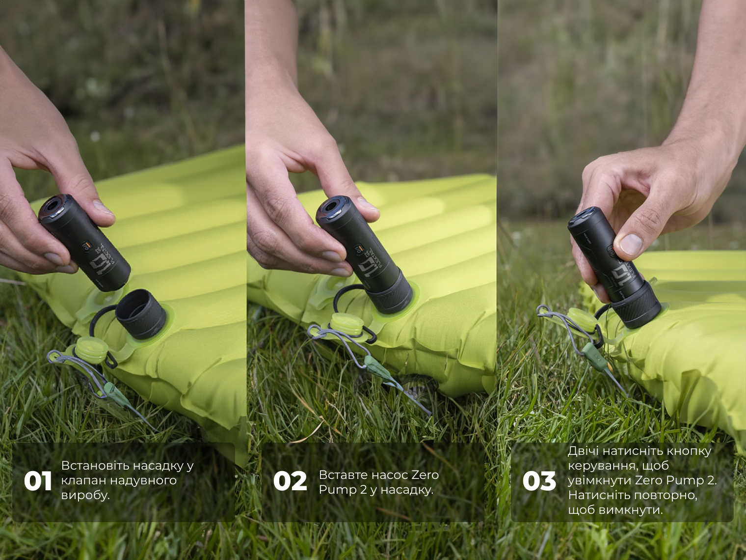 Насос підходить для більшості надувних виробів — від ультралегких килимків до пляжних аксесуарів. Використання Zero Pump 2 подовжує термін служби спорядження, оскільки сухе повітря з насоса не створює умов для появи плісняви всередині клапанів.
