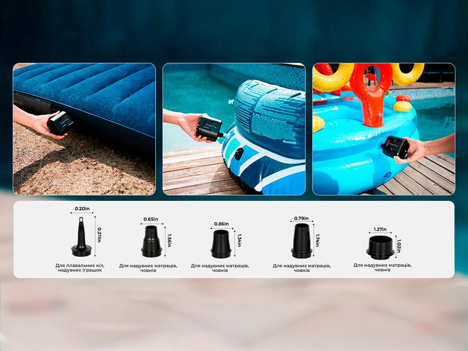 - повітряний насос для надування матраців, килимків, кругів для плавання та інших предметів;