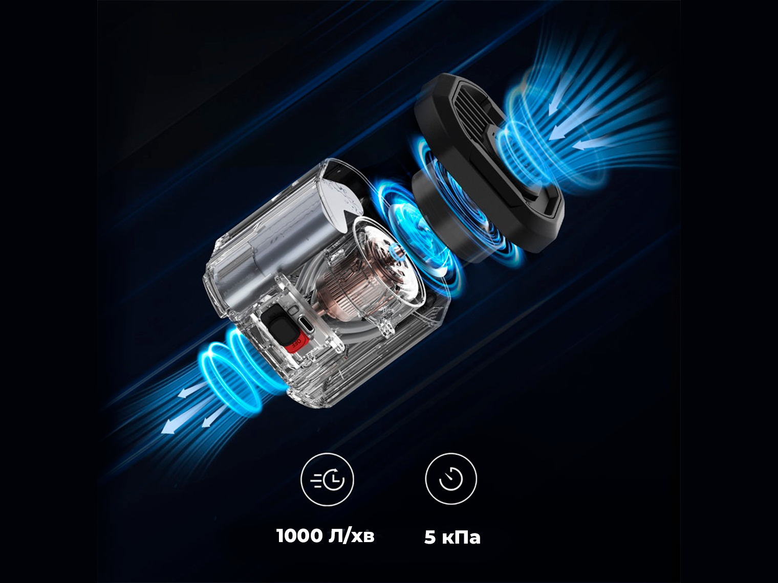 - Робочий тиск 5 кПа. Завдяки високому тиску насос видуває потужний потік повітря до 1000 л/хв, що еквівалентно 1 м³/хв.