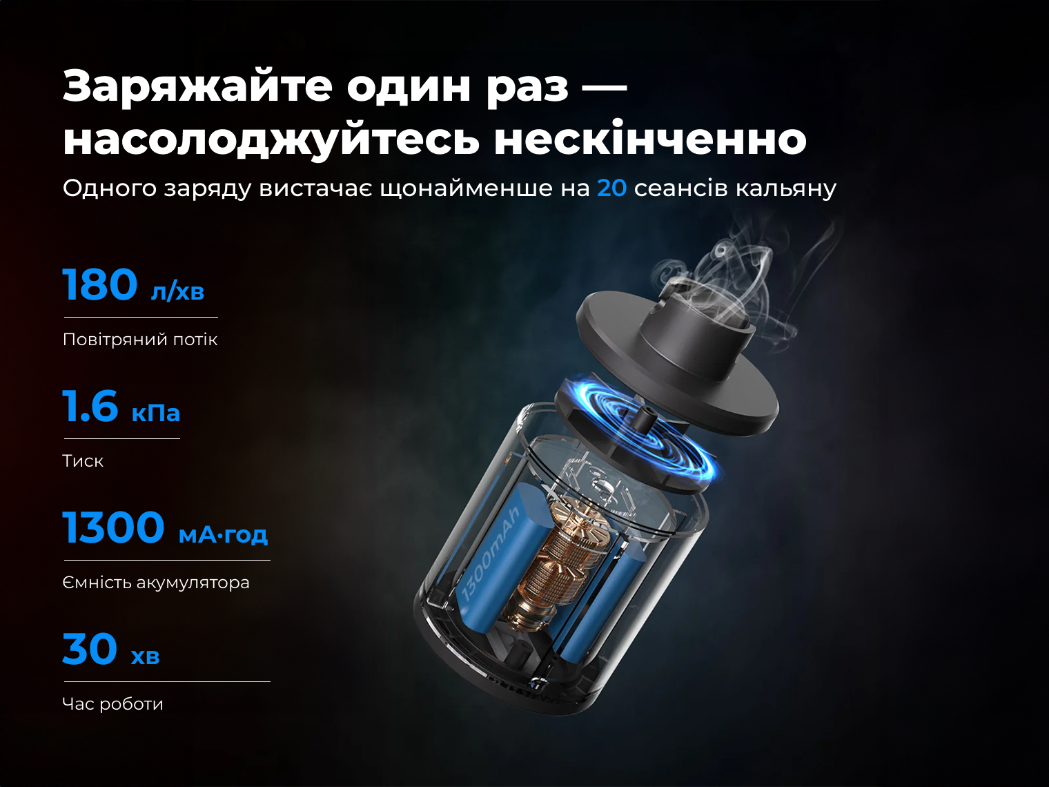 - Миттєве розкурювання. Потужний повітряний потік 180 л/хв готує кальян менш ніж за хвилину. Це заощаджує ваш час і зусилля, повністю замінюючи ручне розкурювання.