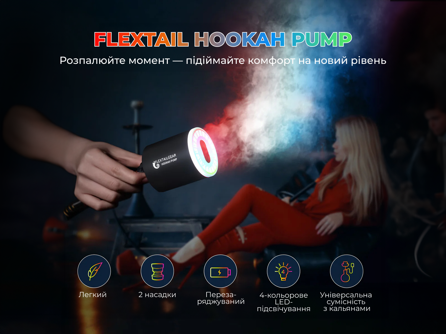 Flextail Hookah Pump — це незамінний гаджет для поціновувачів кальяну, який автоматизує процес підготовки до куріння. Пристрій бере на себе найважчу частину — прогрів тютюну та розкурювання вугілля, що дає змогу насолоджуватися густим димом відразу після підключення.