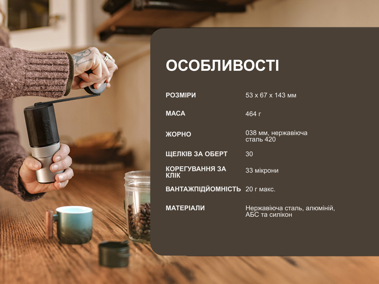 Опис ручної кавомолки Wacaco Exagrind: