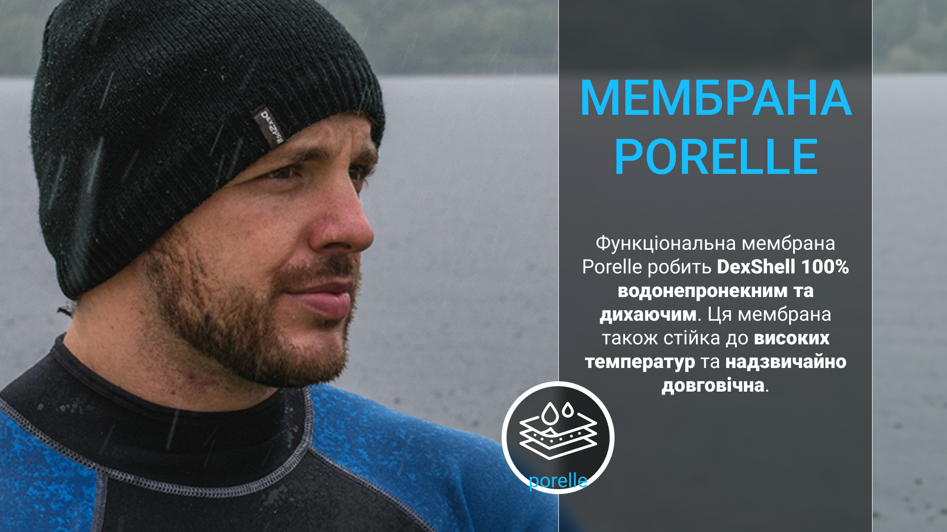 —Головний функціональний шар — мембрана Porelle®, яка виробляється в Англії. Саме вона робить шапку DexShell водонепроникною, і головне — відповідає за ефективне потоотведеніе. Працює еластична і міцна мембрана Porelle® завдяки різниці температур всередині і зовні шапки.