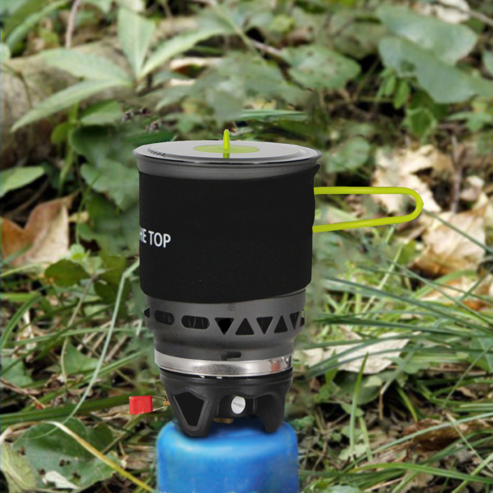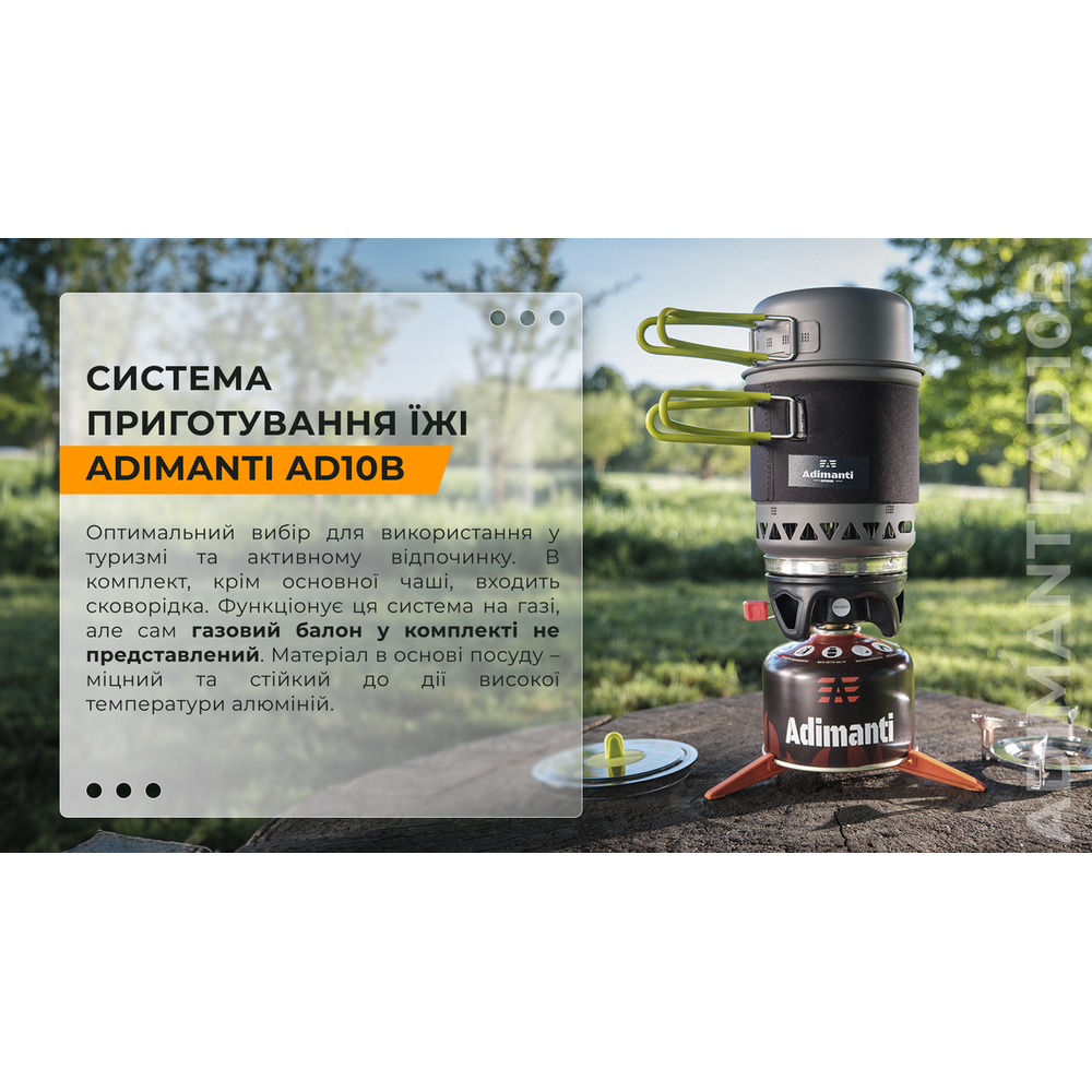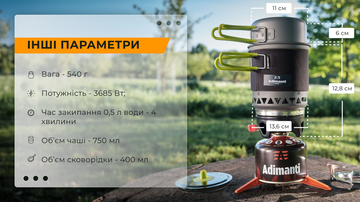 У комплекті не передбачено газового балона. Полум'я генерується рівне і потужне, і не гасне під поривами вітру. Матеріал комплекту: анодований алюміній, легкий та міцний. Великий котел оснащений спеціальною теплоізолюючою тканиною, щоб користуватися безпечно. Малий казанок має ручку із силікону – тому ви можете не побоюватися опіків. У пальнику передбачили вбудований п'єзопідпал, щоб робота була простою та зручною.