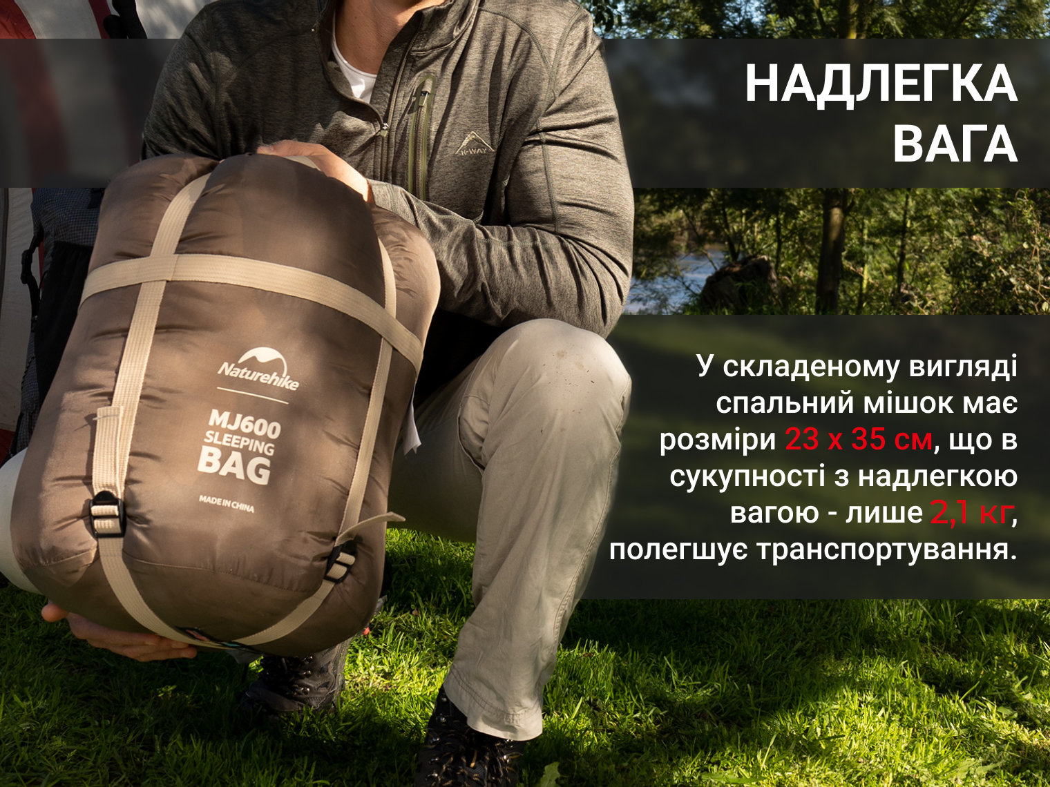 Завдяки багатошаровій структурі матеріалу спальний мішок Naturehike MJ600 ефективно захищає тіло від вологи та холоду, даруючи тілу максимальний комфорт для здорового сну в холодний сезон.