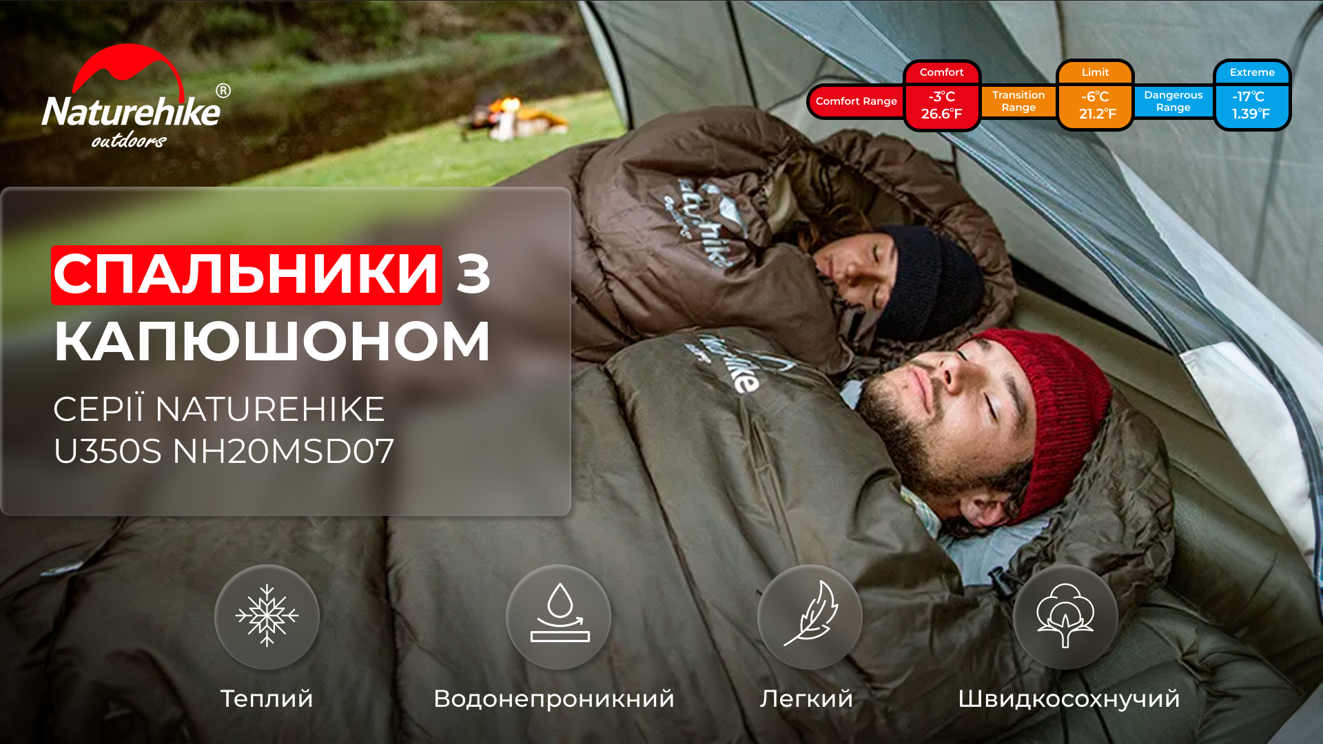 Спальний мішок Naturehike U350S можна брати з собою в подорож як у демісезон, так і в зимовий період, коли стовпчик термометра показує -3°C. Гранична температура повітря для використання цієї моделі дорівнює -6°C, а екстремальна знаходиться на рівні -17°C.