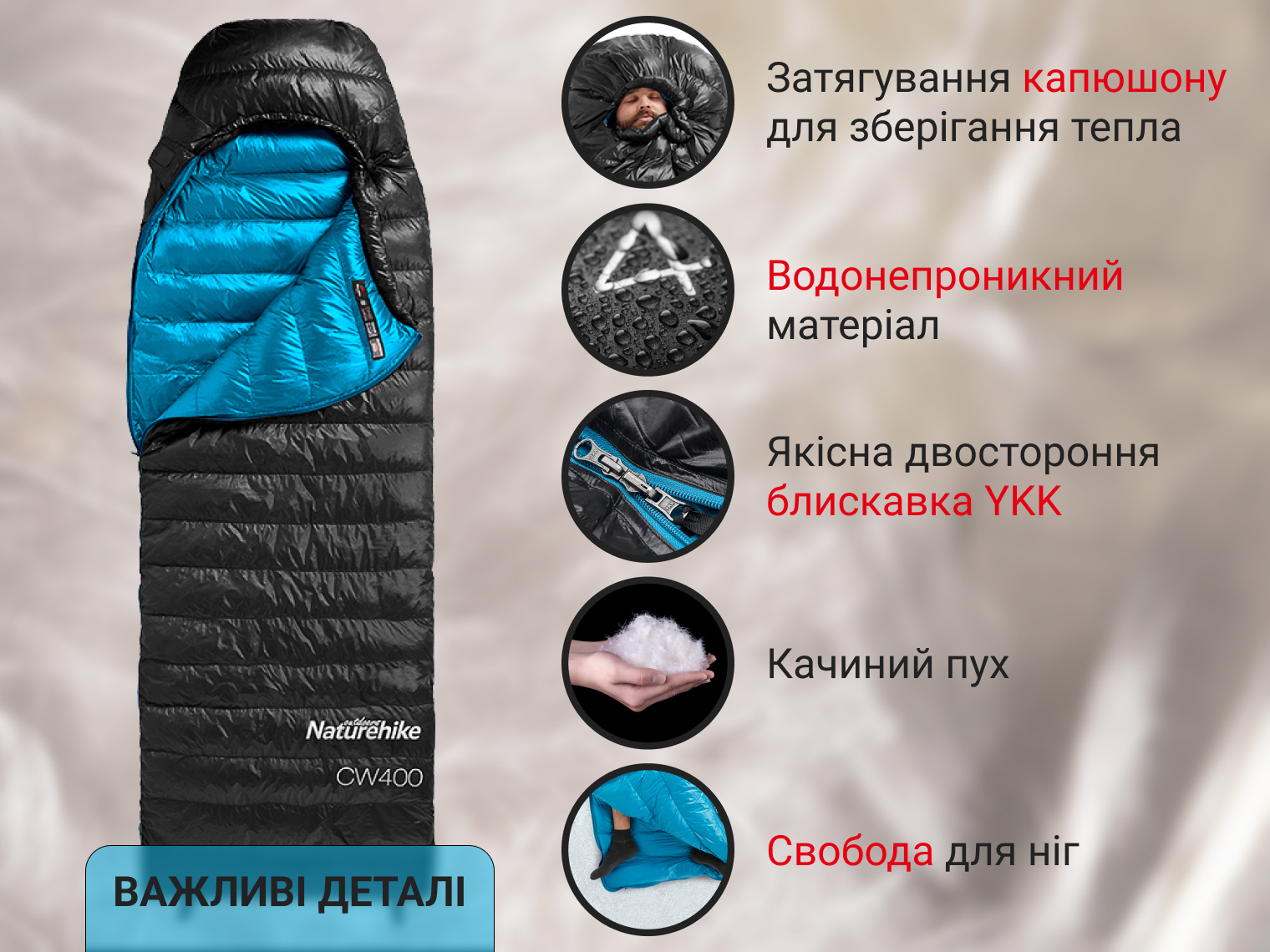 Опис спальника з натуральним пухом Naturehike CW400 NH18C400-D, p-р M, чорно-блакитного: