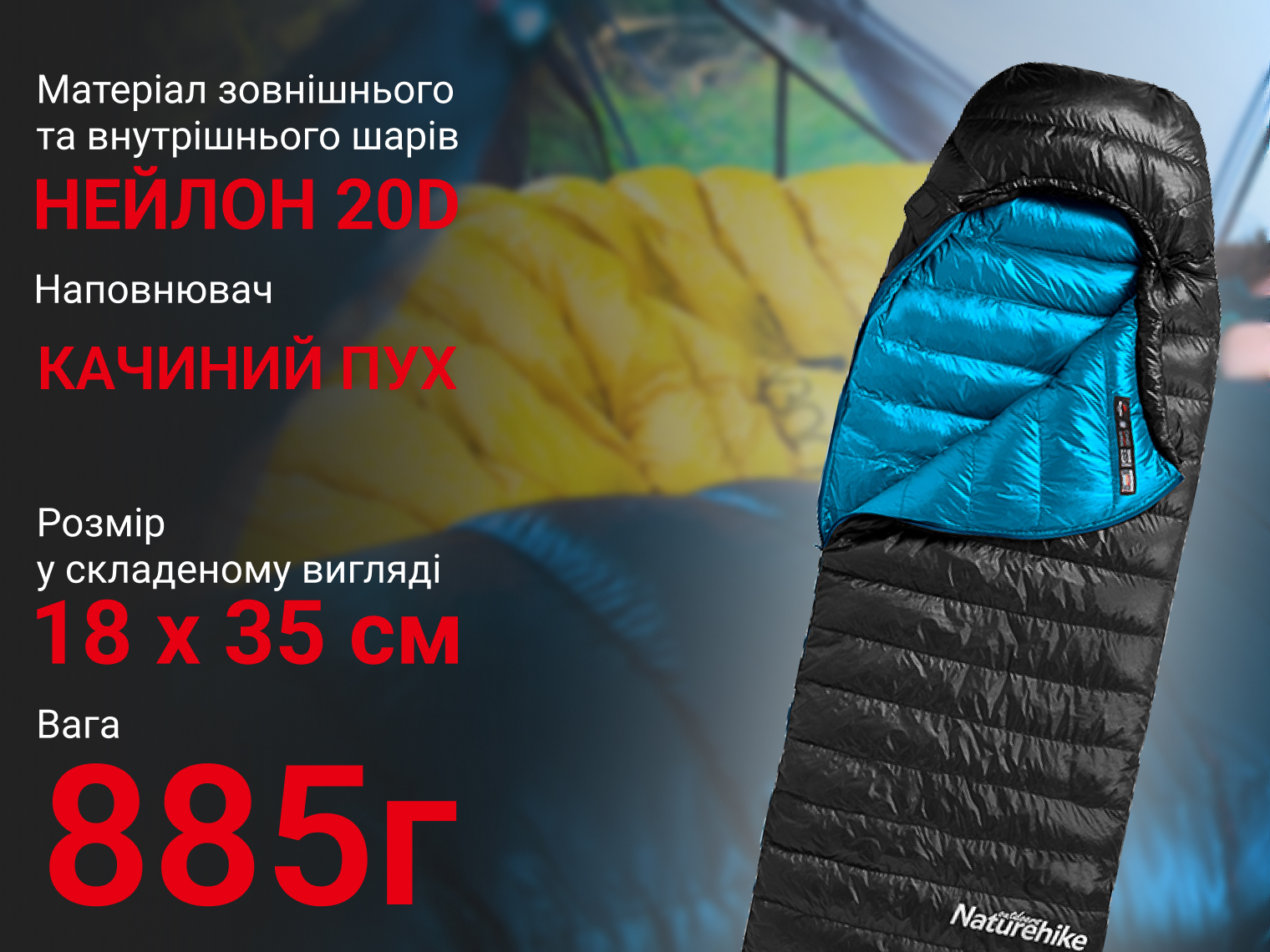 - надлегкий спальний мішок для туристів та військових;
