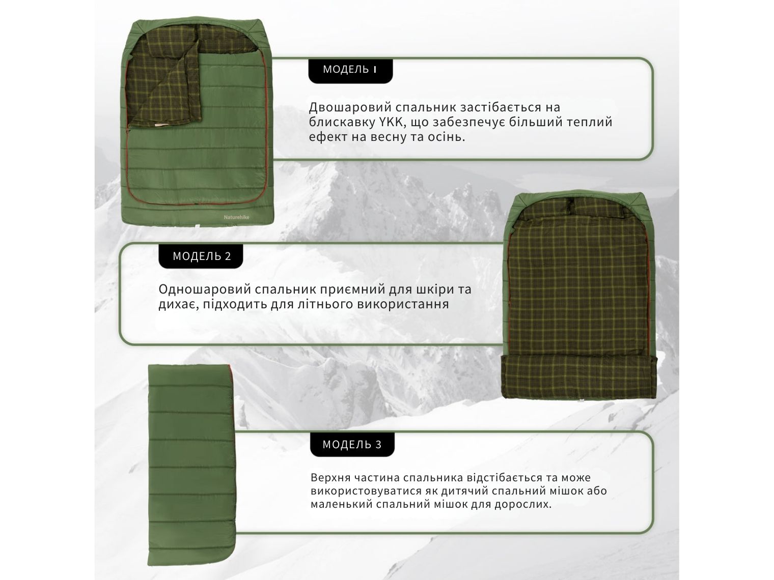 Спальник застібається на блискавки — кожна з двома бігунками. Ви можете адаптувати дизайн під поточні погодні умови: вкриватися верхнім покривалом теплою весною / восени, повністю розстібати модель влітку або складати мішок навпіл, трансформуючи його в одномісну теплу модель для зими.