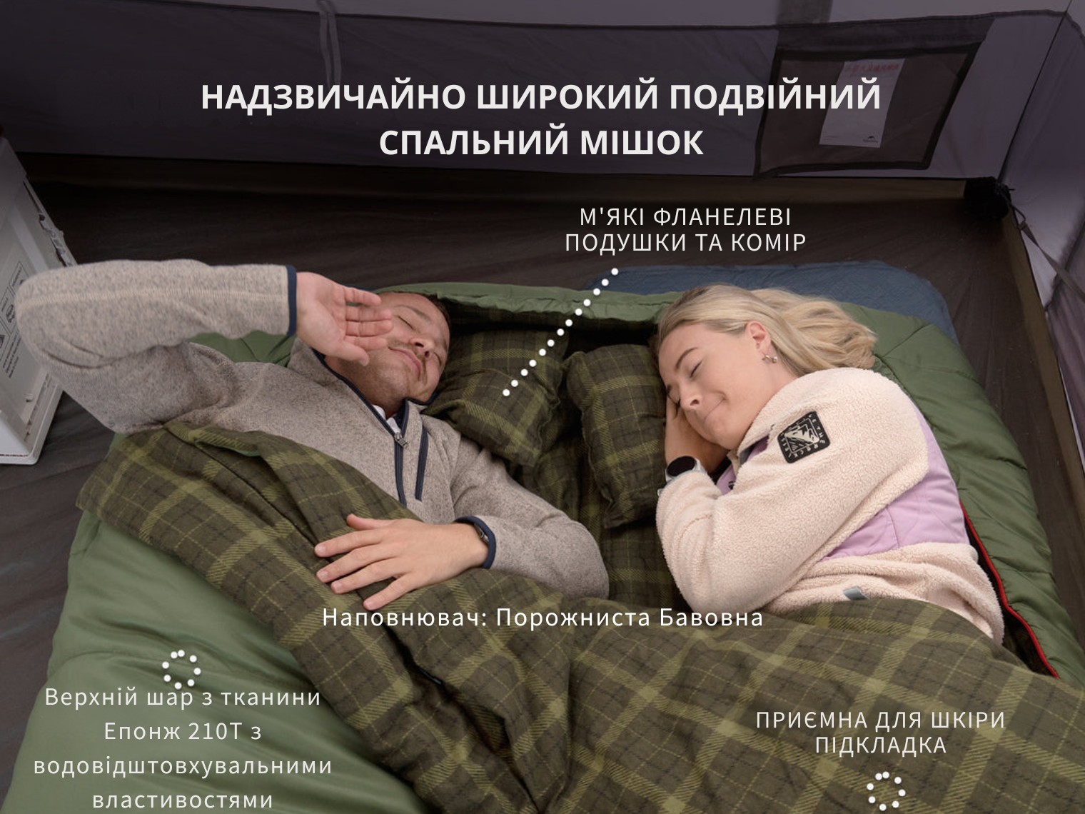 - Наповнювач з гіпоалергенної порожнистої бавовни. Порожня структура волокон утримує природне тепло. У спальному мішку використано двошаровий розподіл наповнювача: зовнішній шар має щільність 300 г/м², а внутрішній — 100 г/м².