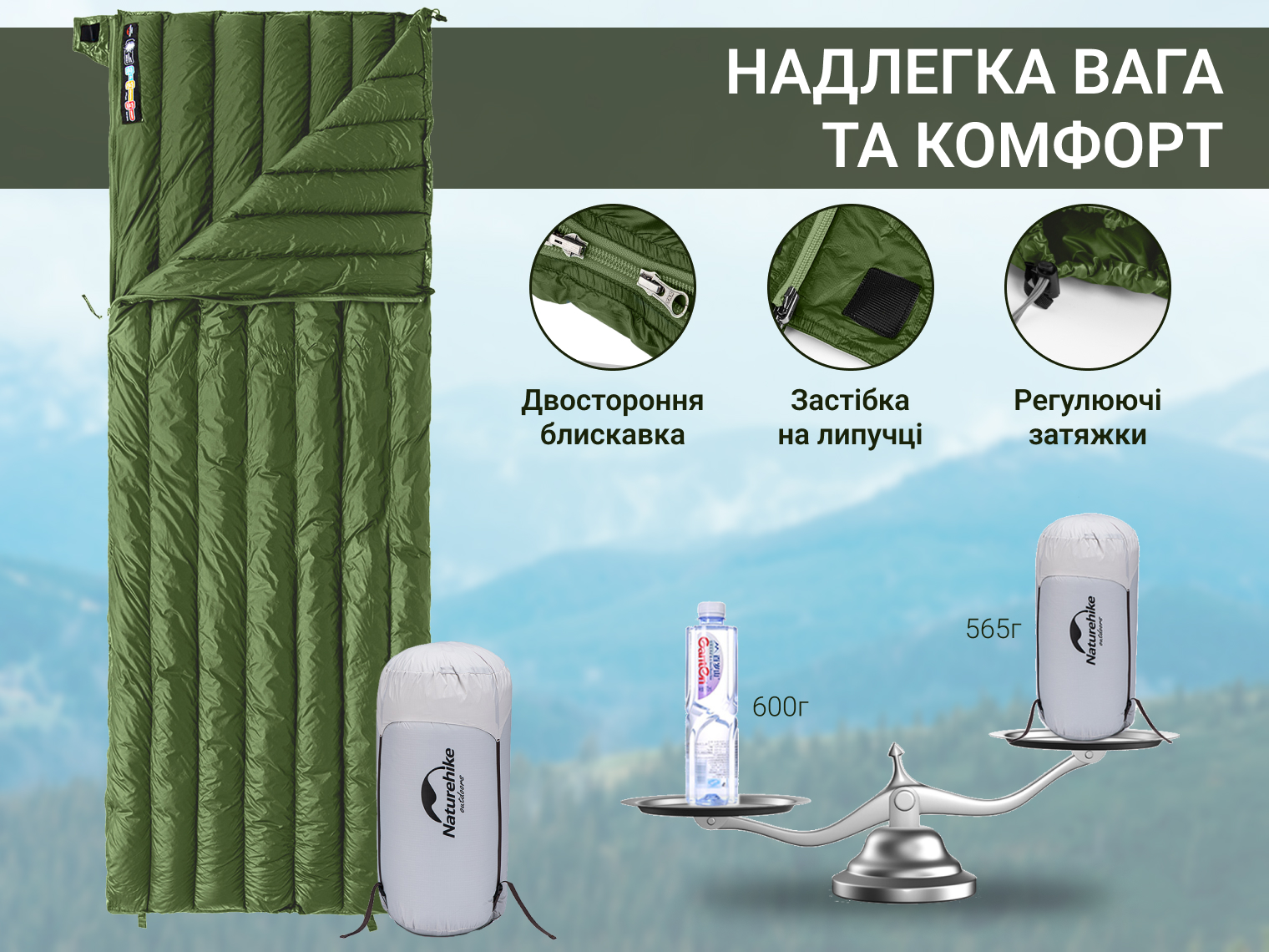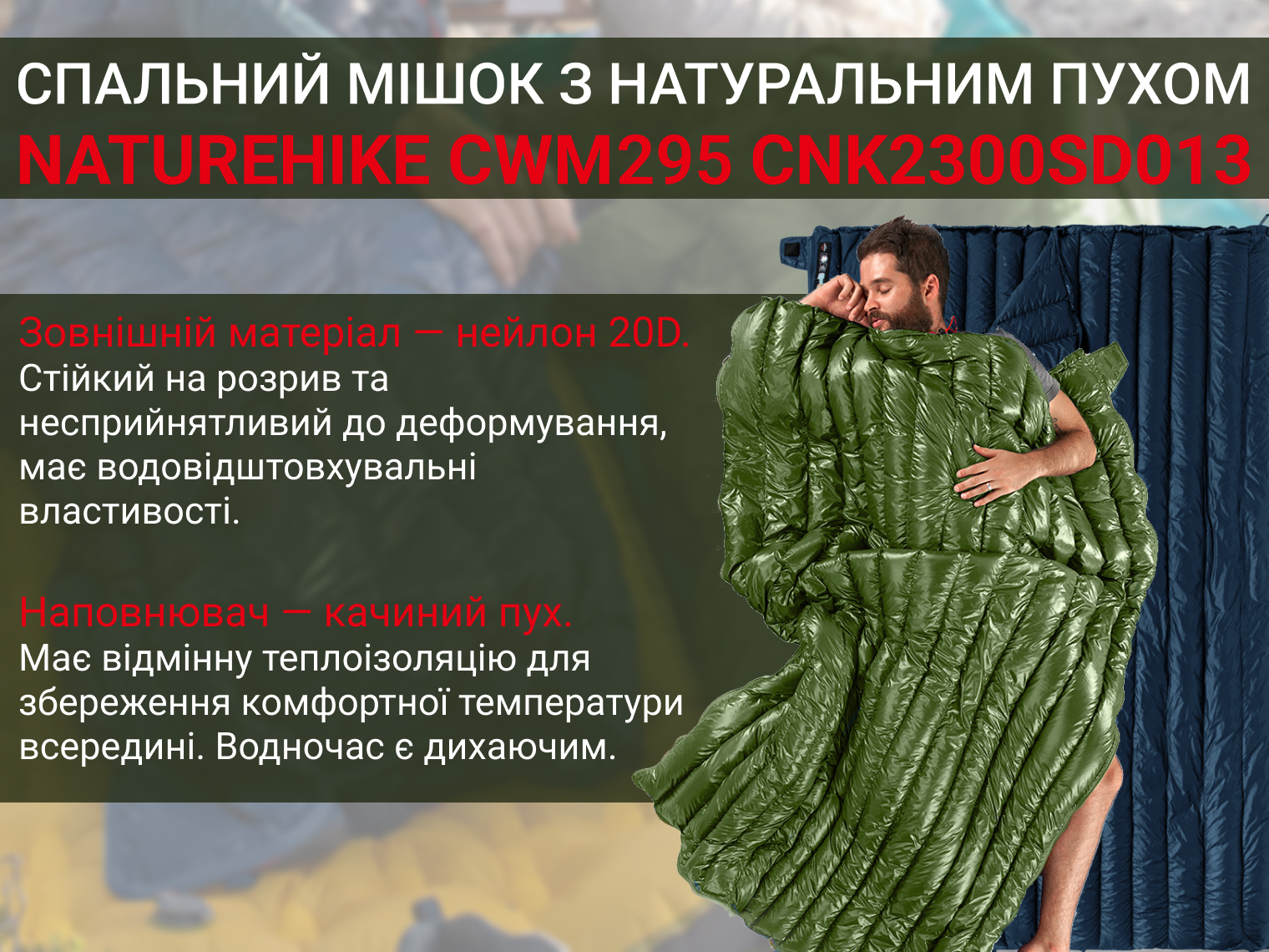 Опис спального мішка з натуральним пухом Naturehike CWM295 CNK2300SD013, зеленого: