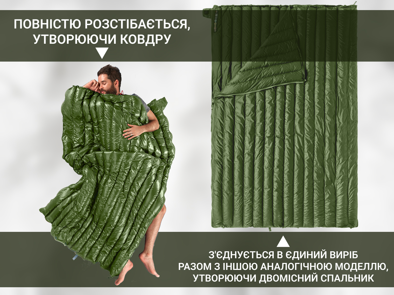 Ще одна корисна функція: система застібок передбачає можливість зʼєднання двох аналогічних спальників у цільний виріб. Це чудове рішення для відпочинку сімейної пари.