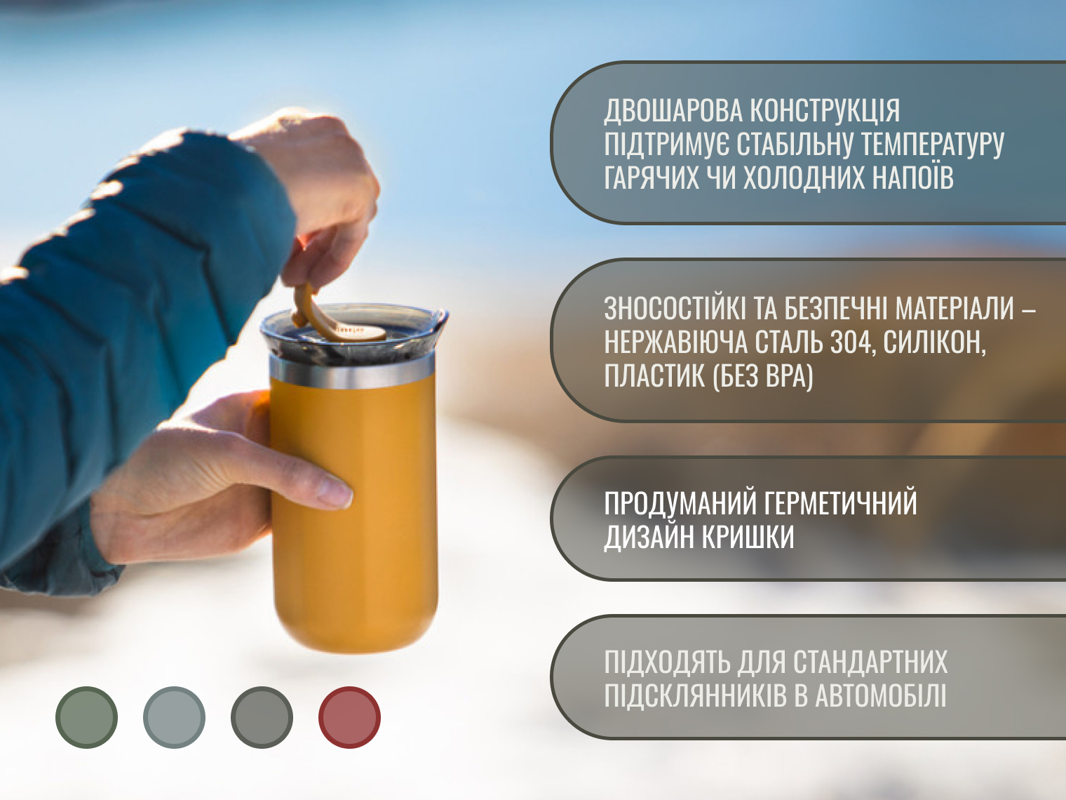 - термокухоль для збереження температури гарячих та холодних напоїв;