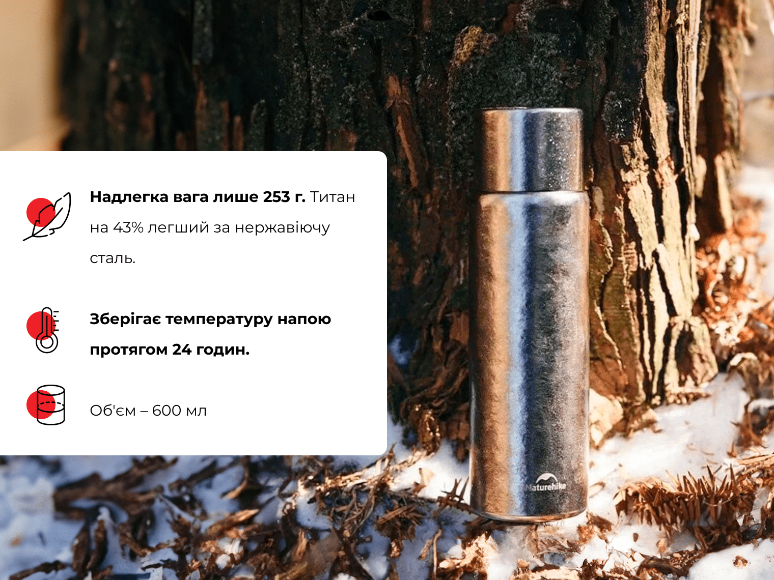 - Надлегка вага лише 253 г. Титан на 43% легший за нержавіючу сталь, тому носіння термоса в сумці або рюкзаку не викликатиме труднощів.