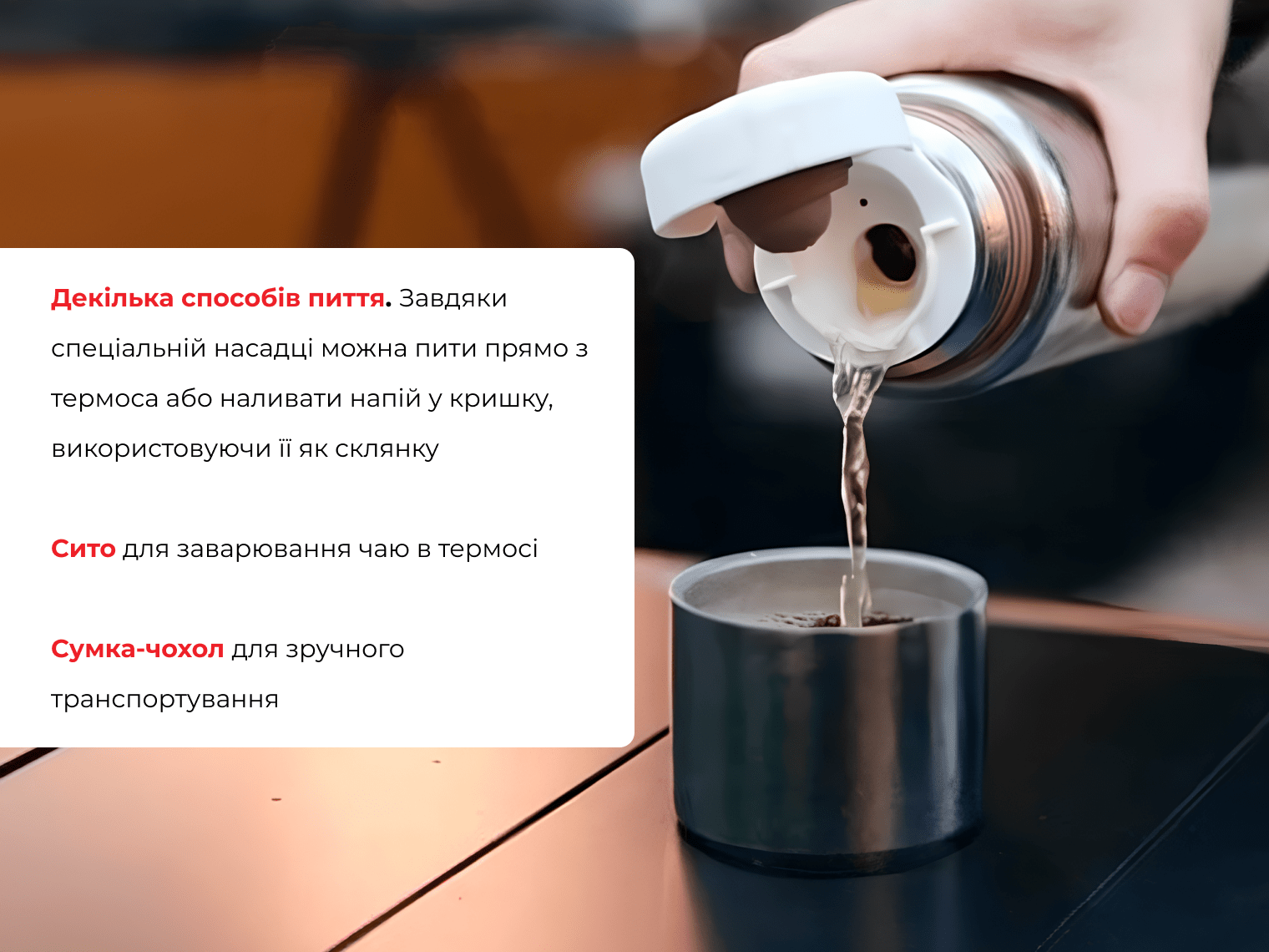 Для любителів чаю термос укомплектований спеціальним ситом, що дозволяє заварювати чай усередині ємності. Більше не потрібно носити з собою додаткові аксесуари — все, що вам потрібно для чаювання, вже є в наборі.