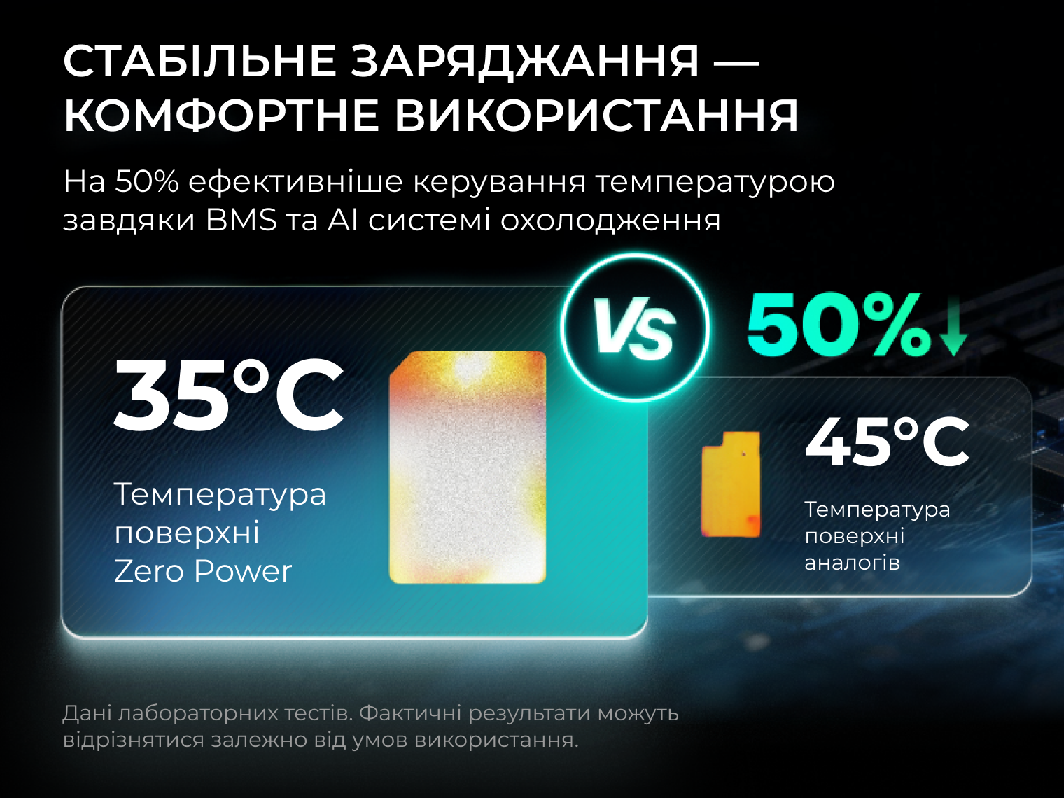 - Система охолодження AI Cooling. У поєднанні з теплопровідністю вуглецевого корпусу система підтримує температуру близько 35 °C. Це забезпечує стабільну роботу пристрою без перегріву.