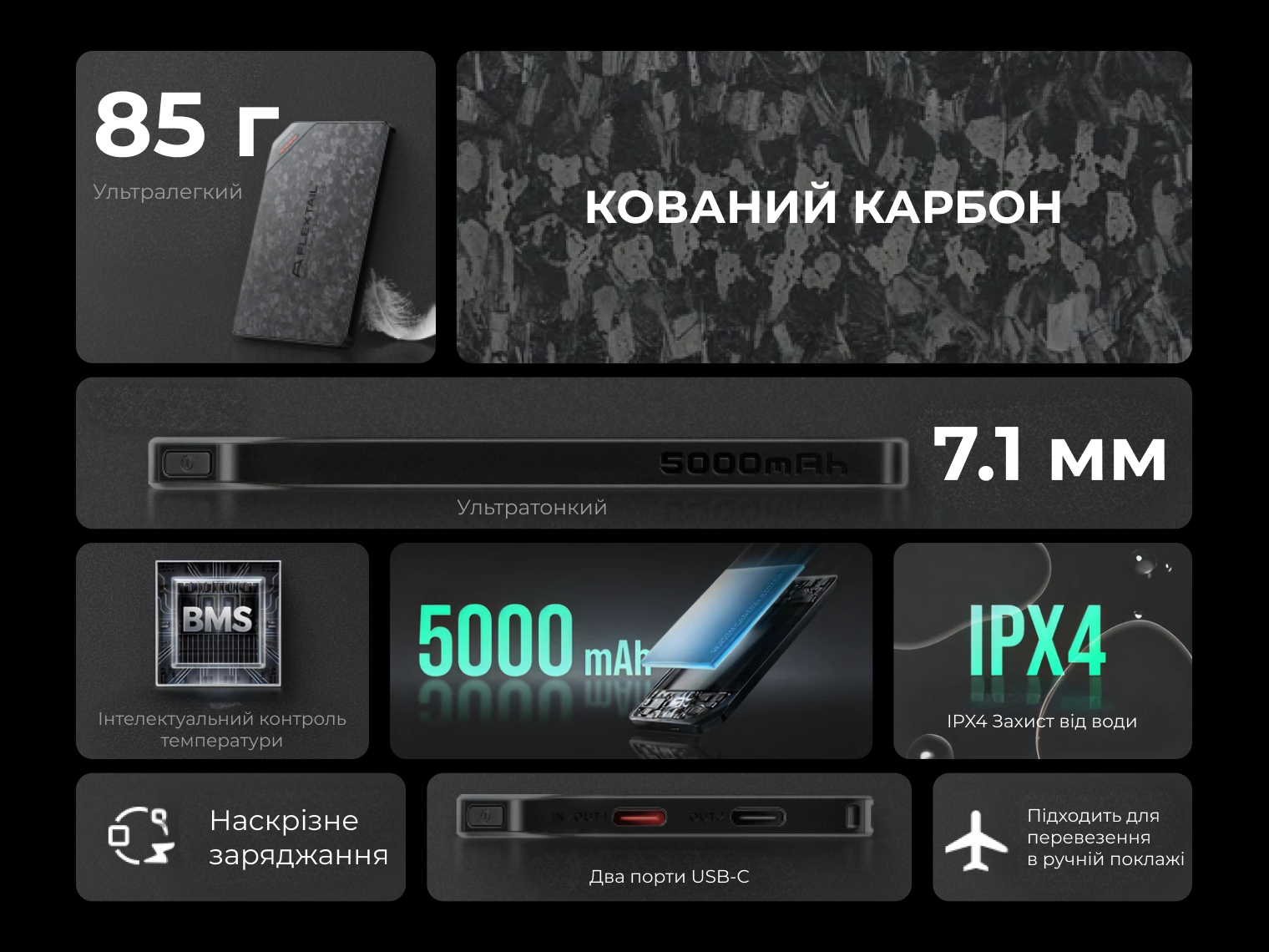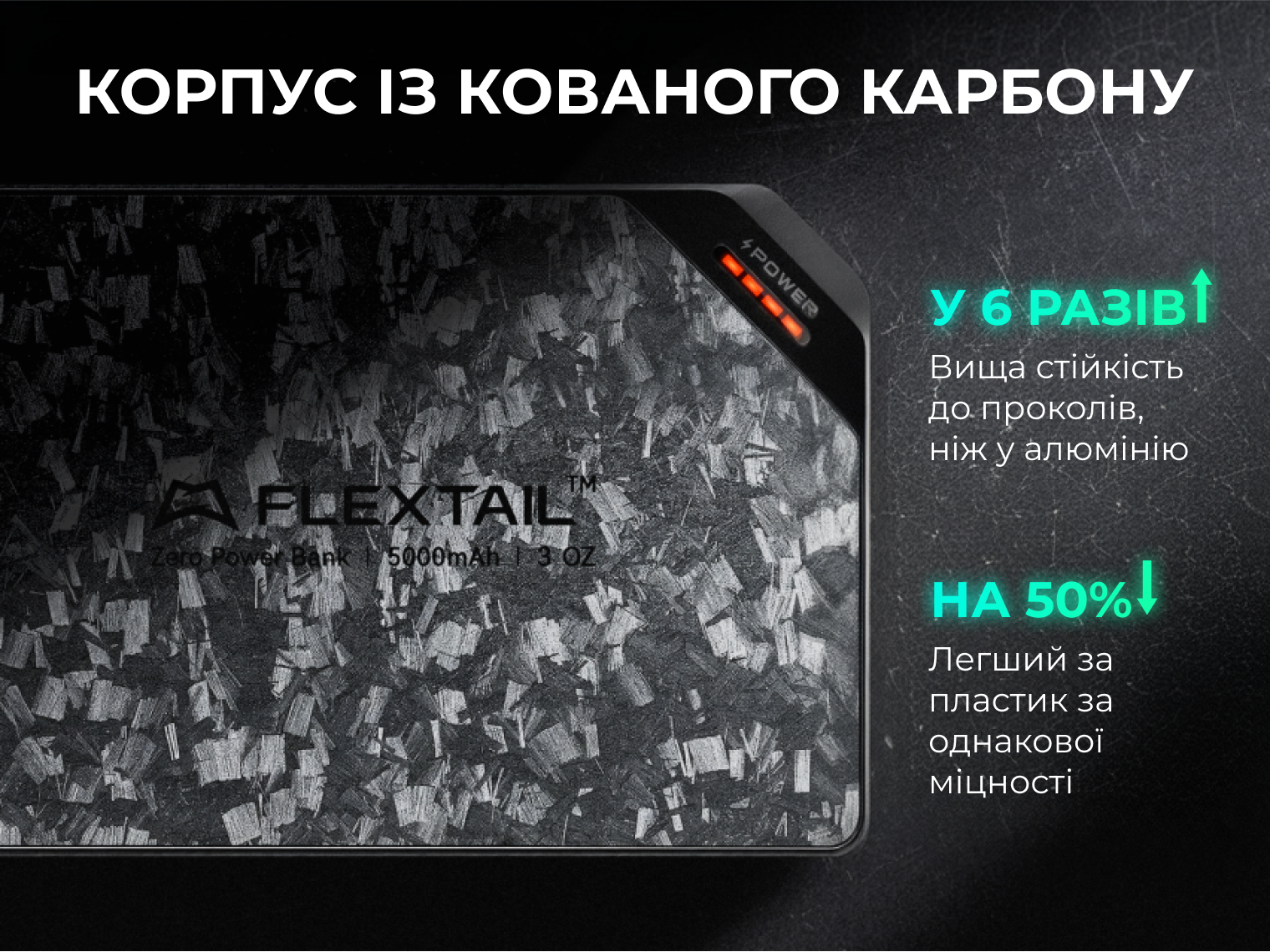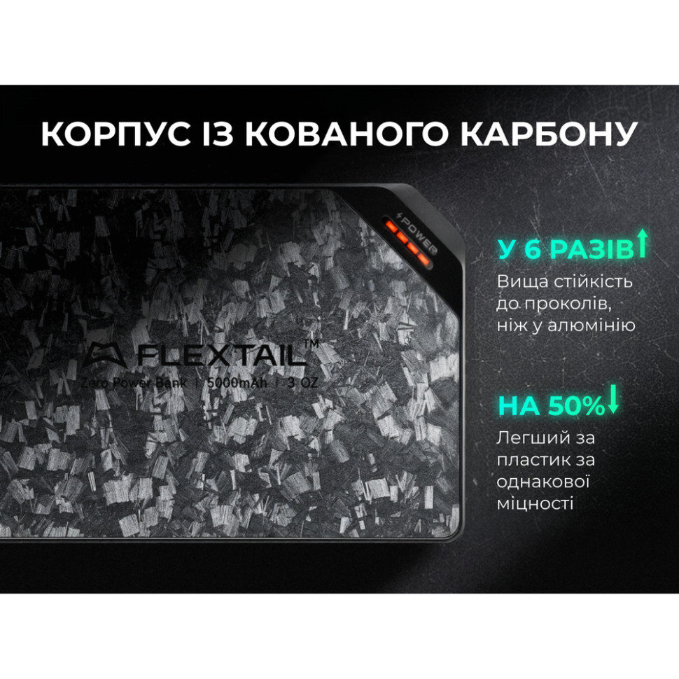 Flextail Zero Power 5000 — це втілення міцності в мінімалістичному корпусі. Зовнішня оболонка виготовлена з кованого вуглецевого волокна (Carbon Fiber), яке використовується в аерокосмічній галузі. Цей матеріал у 6 разів міцніший за алюміній до проколів, що гарантує цілісність батареї навіть у найважчих умовах експлуатації.