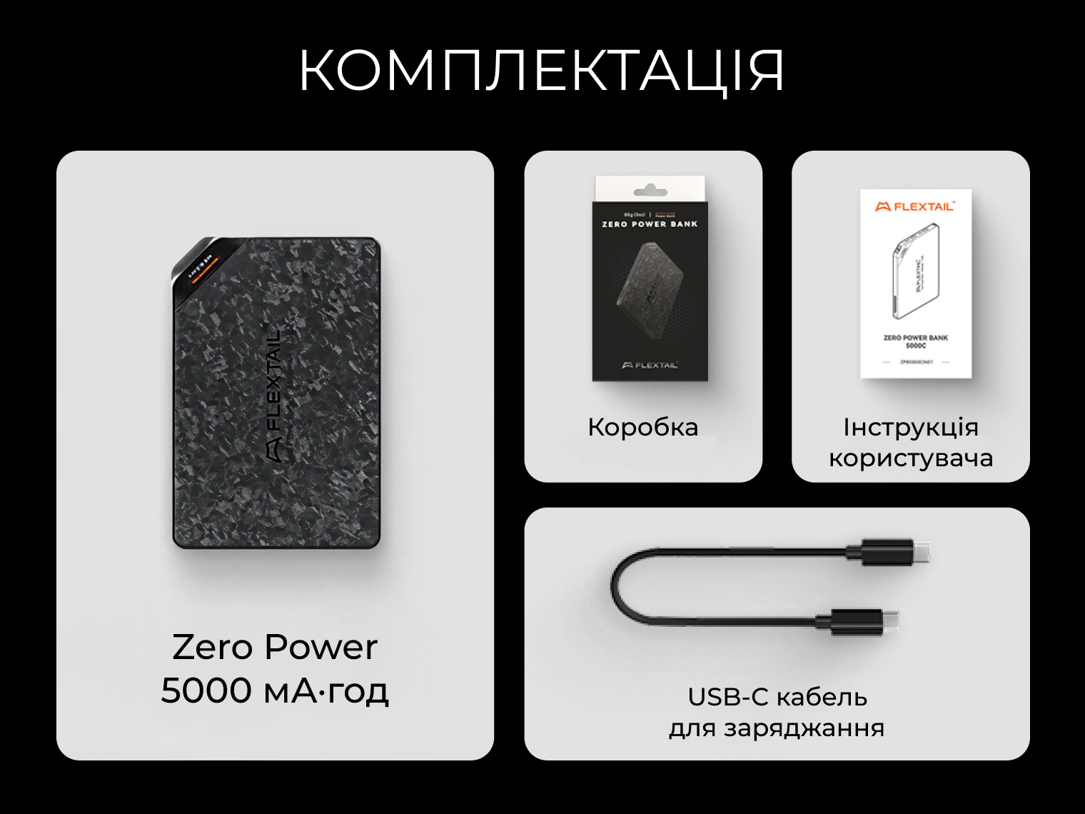 Зовнішній акумулятор Zero Power 5000C, кабель USB-C, інструкція користувача, пакувальна коробка.