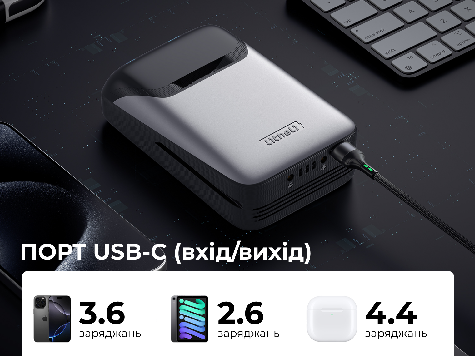 Загальна ємність павербанка складає 74 Вт·год. Цього запасу енергії вистачає, щоб 3.6 раза повністю зарядити iPhone 16 Pro або 2.6 раза — iPad mini. Порт USB-C працює в обидва боки: один і той самий кабель підходить як для зарядки ваших пристроїв, так і для поповнення енергії самого павербанка.