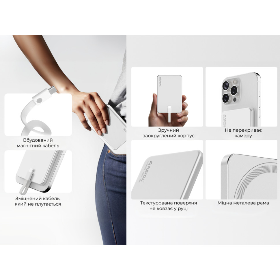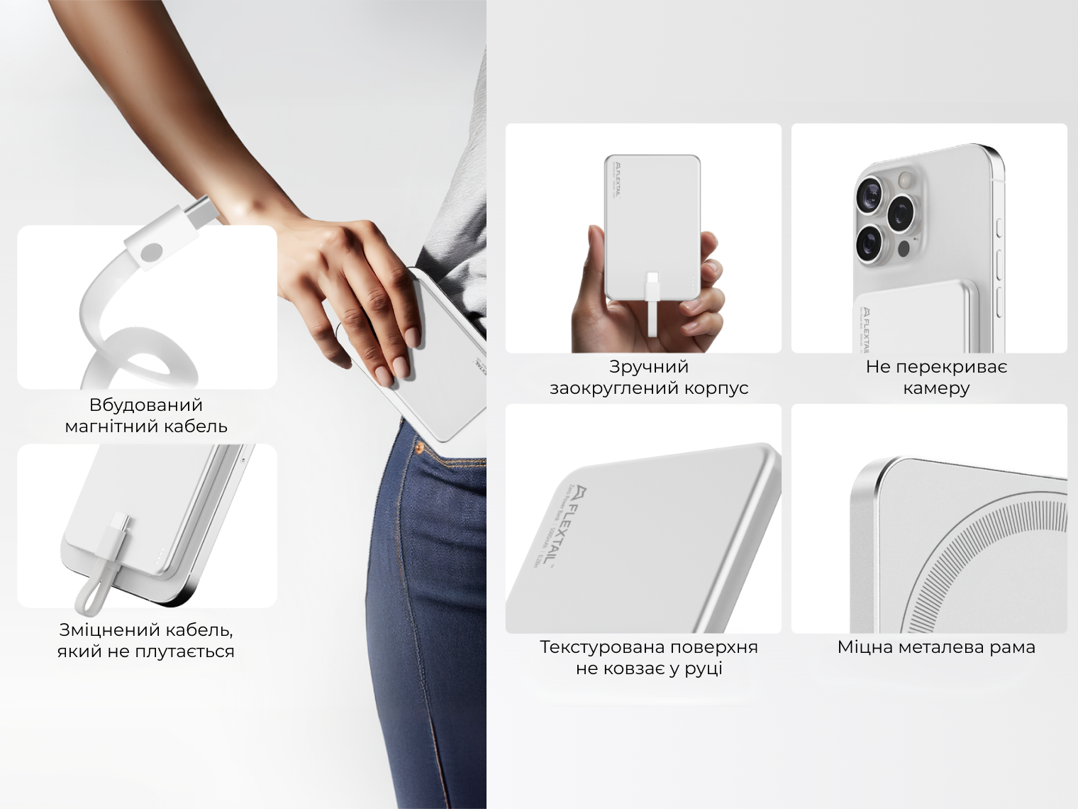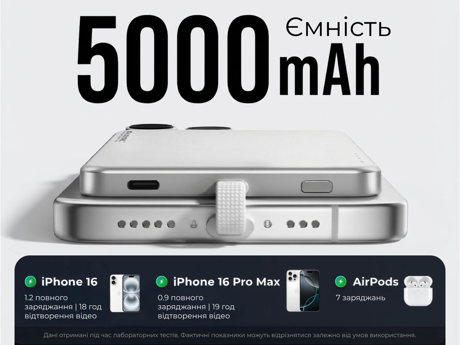 Повербанк підходить для всіх моделей iPhone (починаючи з 12-ї серії), а також для навушників AirPods та Android-смартфонів, що підтримують магнітне кріплення MagSafe.