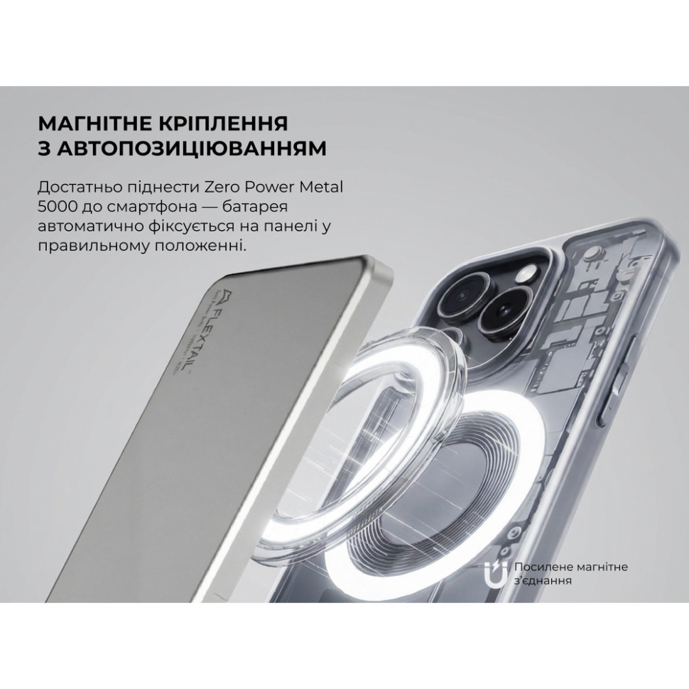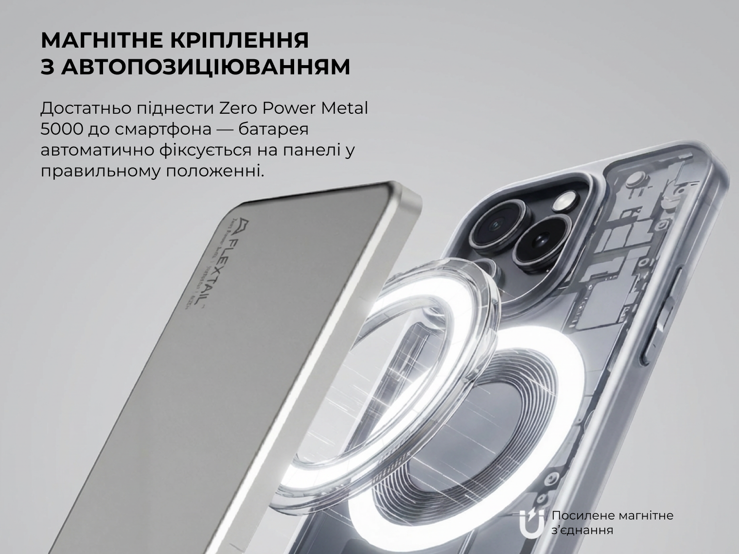 Головна особливість моделі — потужні неодимові магніти. Коли ви підносите повербанк до смартфона, він автоматично притягується і стає рівно по центру задньої панелі. Сила магнітів дозволяє акумулятору залишатися на місці, навіть якщо ви активно користуєтесь телефоном, дістаєте його з кишені або тримаєте однією рукою — пристрій не зсувається і не випадає.