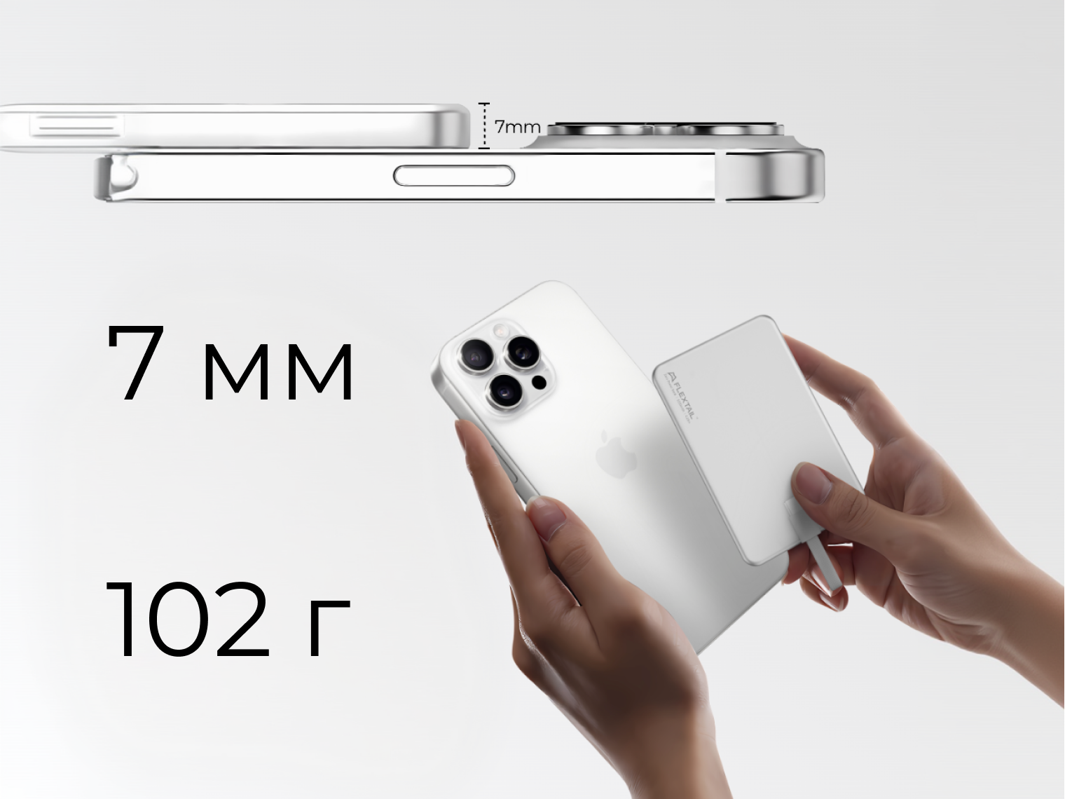 Товщина корпусу складає лише 7 мм, а вага — 102 г. Пристрій тонший за більшість смартфонів і не створює дискомфорту при використанні. Компактні габарити не перекривають об'єктиви камер, що дає змогу знімати на ширококутний модуль (0.5x) без потрапляння аксесуара в кадр.