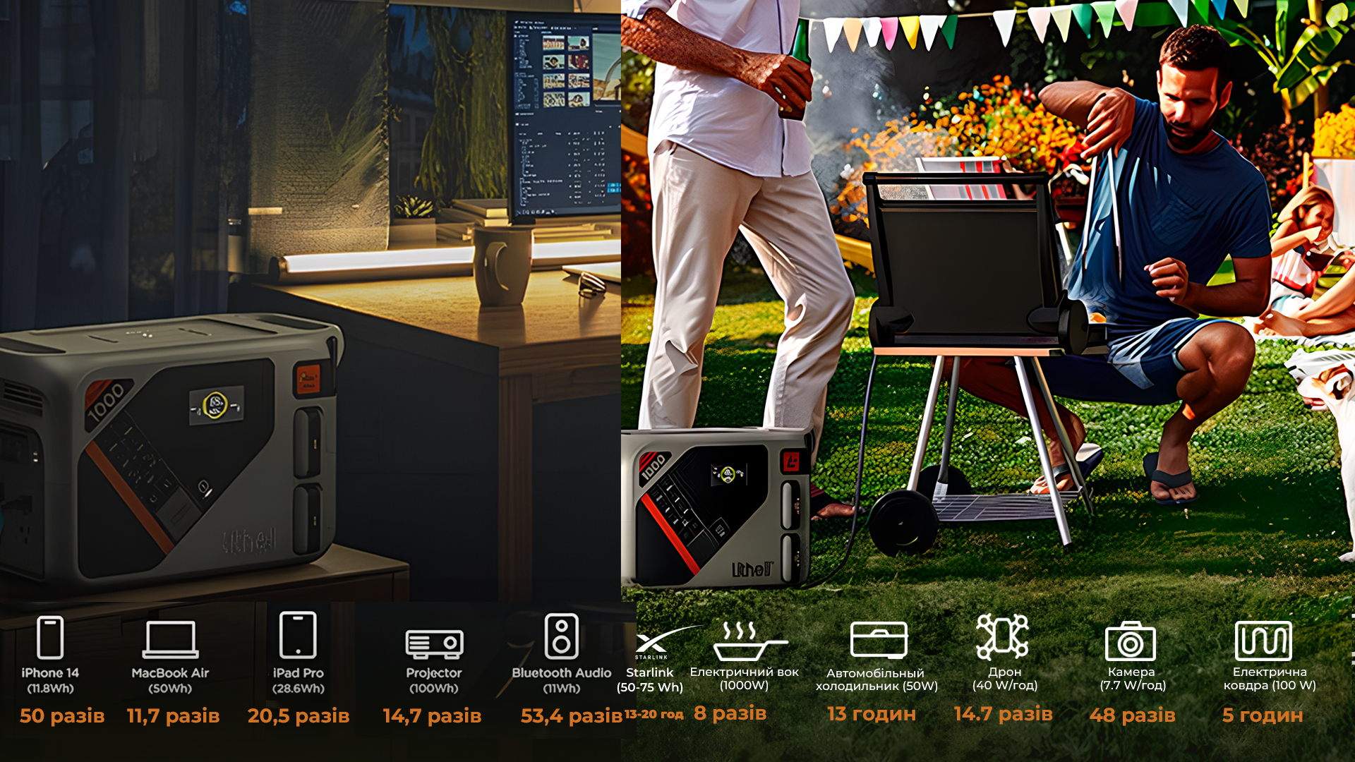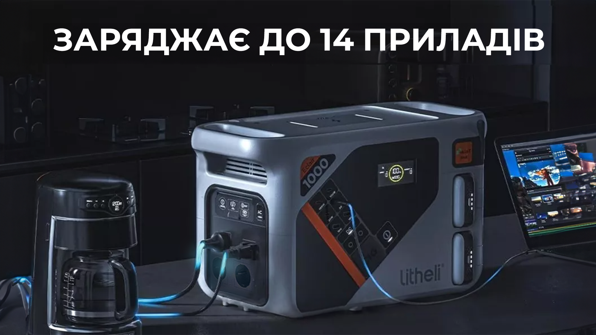Заряджання смартфонів та ноутбуків, забезпечення роботи портативних приладів під час відпочинку на природі та домашньої кухонної техніки — для зарядної станції Litheli B1000 немає жодних обмежень завдяки високій вихідній потужності. Ємності акумулятора достатньо, щоб зарядити смартфон (11,8 Вт) 50 разів, ноутбук (50 Вт) 11,7 разів або квадрокоптер (40 Вт) 14,7 разів. Використання чистої синусоїди Pure sine wave забезпечує живлення двоконтурних побутових котлів.