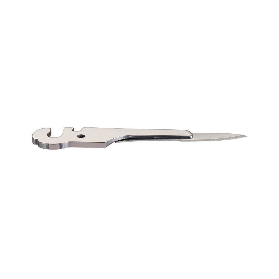 Це мініатюрний скальпель з гострою, як бритва, кромкою, що підходить для здійснення акуратних надрізів. З його допомогою можна розрізати папір, картон середньої щільності, тканинні вироби, а в екстреній ситуації аксесуар дозволить швидко позбутися скалки або розкрити невеликий абсцес.